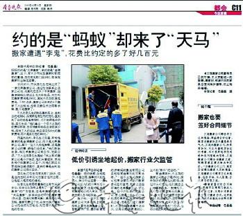 本报11月24日讯(记者 任磊磊) 本报10月31日C11版刊发的《约的是“蚂蚁”却来了“天马”》一文,在济南市搬家行业中引起很大反响。日前,济南市7家规模较大的搬家公司联合签“行业自律”协议,约定了20多项自律规定。 “没人管我们,我们就自己搞。”济南市搬家市场这几年处于混乱无序的状态,不少冒牌军打着正规搬家公司的牌子,公然在网上挂出自己的电话号码。而被冒名顶替的正规军深受其害,经常是消费者打电话来投诉,他们还“丈二和尚摸不着头脑”。但是看在眼里,急在心里,搬家行业的正规军对此无任何对策。 本报刊发《约的是“蚂蚁”却来了“天马”》一文后,让济南搬家行业龙头企业——济南蚂蚁搬家公司非常重视。该公司负责人梁益清为此专门召集了济南市另外几家正规的搬家公司的负责人,商讨搬家公司该如何摆脱困境。 梁益清表示,济南市搬家公司良莠不齐、收费乱,坐地起价现象严重、服务质量没有保障、市民投诉无门等,这些问题不仅导致市民在选择搬家公司时感到困惑,也让一些正规的搬家公司蒙受冤屈和生存受阻。 但是,搬家行业门槛低,技术含量低,一个电话、两个人、一辆车就能成一个团队,而这些团队甚至都不需要到工商部门注册。由此,带来行业散乱、投诉量居高不下等问题。据悉,在2011年4月,济南市市中区曾成立了“搬运装卸协会”。该协会承载着对搬家行业监管的作用,但是并没有执法权。如果有人投诉搬家公司,协会会出面协调解决,但是很多被投诉的搬家公司,根本不是协会会员。协会对其没有约束的权限。该协会目前已经进行了注销。 蚂蚁搬家公司联合济南万泰、兔兔、玉鑫、喜运、天益、重联设备起重公司等几家搬家公司共同约定了行业自律规范。协议中提到目前搬家行业存在的问题:搬家行业缺少统一的标识,如车身广告、工作服等;没有统一的流程,如搬家流程、服务流程、售后流程等;缺少明确的监管机制;没有统一的收费标准,各个公司价格都不一样,高得离谱、低得出奇。 为此,几家搬家公司作出承诺。在今后的搬家工作中,做到:着装统一、规范、干净、整洁;礼貌对待客户,讲话文明;尊重客户的隐私权、风俗习惯;热情回答顾客提问;搬家后妥善清理搬家工作场所;有损必赔、有错必改、有责必担;不收取小费礼品;不临时加价;进行服务回访。