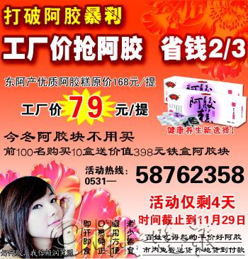| 300g即食阿胶糕原价168元/提,工厂价仅需79元前100名拨打热线0531-58762358订购10盒送价值398元铁盒阿胶块,送完即止 | |