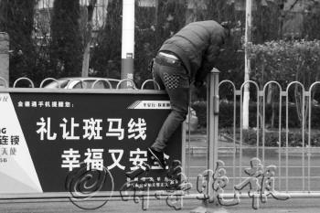 24日,在东风路上,一市民图省事从栅栏上“爬过”马路,“既不幸福又不安全”。