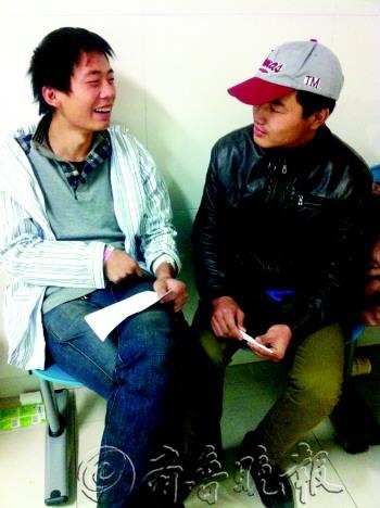 | 22日,刘浩(右)陪同工友王超做检查。 邱晓宇 摄 |