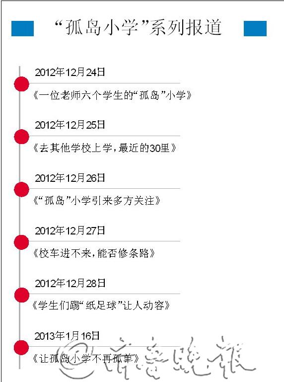 孩子们教 小记者摘棉花 记者手记 “孤岛小学”系列报道 在棉田里,小记者和孤岛小学的孩子们一起劳作,帮助棉农把成熟的棉花摘下来。由于城市里的孩子很少接触这样的农活,孤岛小学的孩子们就充当起了老师,向小记者们传授摘棉花的技巧。“这种开了的,四个手指头抓住一揪,就下来了,然后再把这里面剩下的棉花摘干净就行了。”张振清一边示范一边说。 学会了之后,所有的孩子都分散开来。“我快拿不了了,把袋子拿过来装一下。”“我这边也有一些。”“把这些也放到袋子里吧,帮忙递一下。”……一名小记者和孤岛小学上一年级的张井深突然拉住记者,“老师我发现一件事儿,我们都觉得这样挺好的,能帮助别人还能锻炼自己,我们在一块玩得也很高兴。” 孩子少了,爱心不少 2012年12月24日 去年12月份,我们经过四个多小时的寻找,第一次来到这所“孤岛小学”。这里真的像一座孤岛,去最近的村子开车也需要近半个小时,而且通往村子的道路全部是土路,雨后无法通行。就在这样一个村庄里,却有着一个老师和六名学生在坚守的小学,按正常时间上下课,风雨无阻。 经过一年的关注报道,我们和安利志愿者们一起发起了“让孤岛小学不再孤单”的公益行动,那些志愿者们为这些孩子们送去了新桌椅和文具,并为他们买了新的炉子,让他们冬天不再寒冷。今年11月,我们第四次来到这所小学,教室内的环境已经有了很大变化,学生们也依然热情。但是我们了解到,本应该六名学生的学校,现在仅剩下四名学生,除了一名今年刚刚入学的新生外,已经有三名学生转去外面上学。当年学校里的班长张金正告诉我们,他每天早上六点起床,坐爸爸的车去王坟村等待黄庄子学校的校车,然后坐校车去学校上学,“新学校好,同学也好。”张金正小声地回答着我们的问题。当年热情好客的小朋友经过一年的时间,开始变得腼腆,从他躲闪的眼光中也许我们可以猜测,在外面上学功课跟不上,或许同学不合群,但是为了今后的发展,他的父母还是选择了转学。 我们离开时,学生们依依不舍地送别。看着他们单纯的面孔,我们不知道这所小学还能继续坚持多久,因为村子里越来越多的孩子选择外出就读。但是我们依然愿意给他们最大的爱心,去温暖这所“孤岛小学”。 《一位老师六个学生的“孤岛”小学》 2012年12月25日 《去其他学校上学,最近的30里》 2012年12月26日 《“孤岛”小学引来多方关注》 2012年12月27日 《校车进不来,能否修条路》 2012年12月28日 《学生们踢“纸足球”让人动容》 2013年1月16日 《让孤岛小学不再孤单》 “孤岛小学”相关报道。