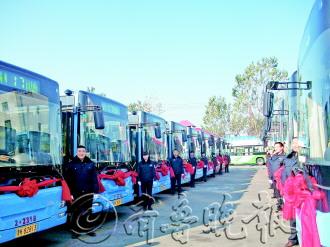 | ◤22日上午,13辆环保车辆已经到位。在威海公交集团二公司院内,13辆新车身披大红花,整装待发。 记者 冯琳 摄 |
