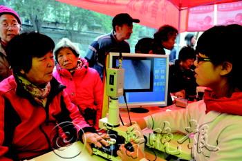 本报记者 王鸿哲 摄 |  | 工作人员用微循环显微检测仪给社区居民查体。 本报记者 王鸿哲 摄 |