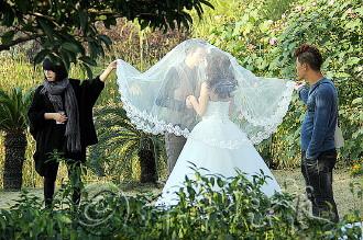 时间:2013年11月11日 自述:一对新人在公园里拍婚纱,旁边的一男一女帮着拿着头纱。 点评:于是,婚纱照就这样诞生了。