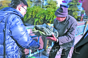 26日,市救助站工作人员把棉衣送给一名街头流浪人员。  本报记者 陈文进 摄