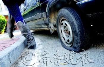| 小区内停在路边的车被扎破轮胎。 本报记者 李泊静 摄 |