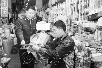 25日,在潍坊小商品城,消防官兵向业户分发消防宣传单页。冬季是火灾的高发季节,潍坊市消防支队宣传科到小商品城等人员密集场所开展消防宣传活动,提醒市民注意冬季防火,防止火灾发生。