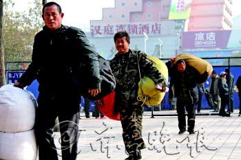 11月26日,在火车站背着行李踏上回乡路的农民工随处可见。  本报记者 王小会 摄