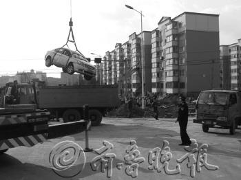 25日下午,在斋堂岛街,城管执法人员正在清理损毁车辆。自22日爆炸事故发生以来,开发区城管已清运了71辆损毁车辆。