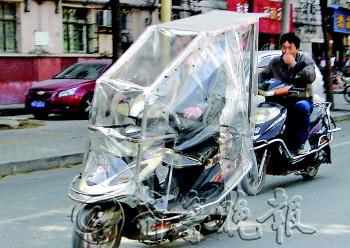 自述:骑车越来越冷,这人竟搭出个塑料棚子,不安全啊!