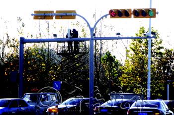 今年,德州市交警部门对市区路口安装监控设备,大部分已经安装完毕。11月27日,技术人员在对三八东路与康博大道路口处的监控设备进行调试。 本报记者 马志勇 摄