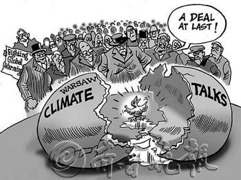 “华沙气候谈判”巨蛋裂开,出现了一只小鸡。旁边的谈判代表说:“终于有了一个结果!”图左男子手拿的标语上写着“与全球变暖作斗争”。华沙气候变化大会11月23日闭幕,各方经过讨价还价达成“不满意但能接受”的一些共识。