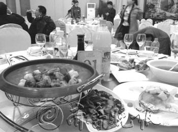 | 1月25日,北京某酒店内,一家公司举办的晚会宴会结束后,领导席的饭菜几乎都没动。(资料片) |
