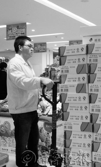 | 爱心苹果在振华量贩超市销售火爆,工作人员忙着补货。
