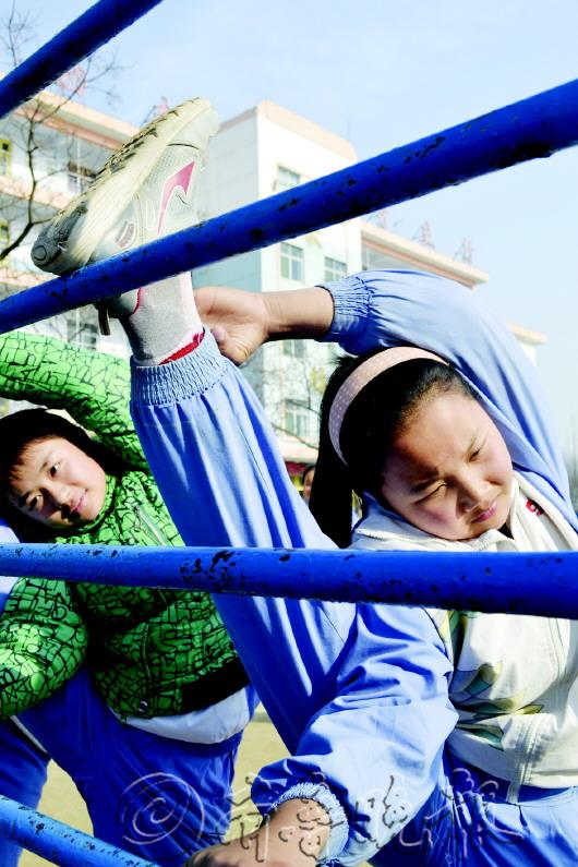 | 学校除了乐队还有舞蹈队,学习舞蹈的孩子们在压腿。 |  | ◥横笛也是孩子们的强项。 |