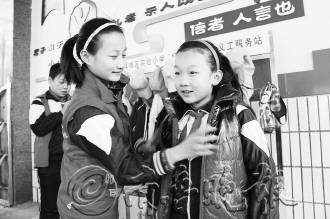 11月27日,峄城区实验小学高年级学生正在帮找到失物的小学妹穿衣。该校日前设立了“红领巾爱心义工服务站”,将学生丢失的衣服、文具等物品集中在此,并安排有爱心的学生值勤服务师生。 胡乐彪 刘洋 摄影报道
