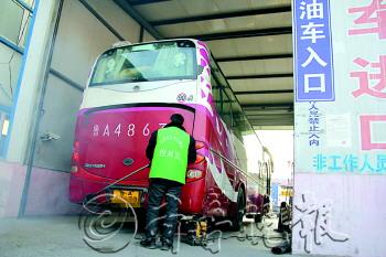 | 一辆大巴车在黄岸岗检测线接受尾气排放检测。 本报记者 张泰来 摄 |