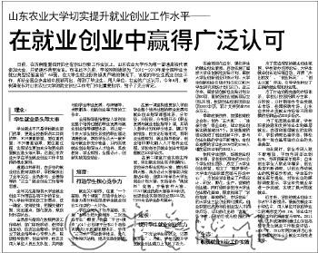 山东农业大学切实提升就业创业工作水平—— 在就业创业中赢得广泛认可 理念: 学生就业是头等大事 学生就业不只是学校就业部门的事,更是全校教职员工共同的事;不只看重数量,更注重质量;不只看重结果,更注重过程,实现学生更加充分和更高质量就业是头等大事。这是山东农业大学在学生就业创业工作中坚持的根本原则。 遵循这种原则,在多年的就业创业教育实践中,学校凝练出了全年关注、全员参与、全程指导的“三全”就业创业工作指导思想。 全年关注是指将大学生就业创业工作摆在各项工作的首位,列入学校年度党政工作要点,统一调度、统筹安排,把握关键时期,突出重点、强化服务,做到时时在状态。 全员参与指深化校院两级工作体制,部门学院联动,教师学生互动,校友社会驱动。学校建立了就业指导中心专职人员、院级指导教师、创业导师、校友及用人单位人员五支队伍,共同参与到学生职业发展、考研辅导、求职服务、创新创业等方面的工作中。 全程指导是指贯穿入学到毕业整个培养过程的职业发展与就业创业指导课程体系,将让每一个农大学生接受系统的职业理论课程教育,帮助学生从大一就开始为就业作充分准备,从而实现就业创业指导与人才培养、思政教育、学业规划、生涯设计、创新实践紧密结合。 培育: 打造学生核心竞争力 就业关口前移,注重“一个基础,两个课堂”打造学生核心竞争力是该校在促进学生就业创业工作中的一大特色。 学校立足人才培养基础,实施“本科生按大类培养,二次选择专业”制度,构建“平台+模块”(4个必修课平台和2个选修课模块)开放性课程体系,采用“三三式”实践教学体系,优化学生知识结构,提升实践创新能力。 在第一课堂构建贯穿入学到毕业整个培养过程的职业发展与就业创业指导课程体系,分年级、分阶段、分专题开设《职业发展与就业创业指导》课,并纳入教学计划和学分体系,辅以专家报告、校友论坛等形式,将职业生涯规划、就业指导教育、创业培训孵化融入人才培养全过程。学校每年仅就业创业专题讲座就达100多场次。 在第二课堂打造实践主阵地,突出就业创业实训和模拟。学校举办职业规划大赛、模拟招聘大赛、简历设计大赛等实训竞赛近40场,连续10年举办大学生创业计划大赛。先后举办“挑战杯”竞赛、齐鲁软件大赛、ITAT就业技能大赛等200余项,校级创业实践项目立项231项,7000余名学生参与其中。 成长: 提升学生就业创业能力 “不光让学生好就业,还要就好业”。为此,学校在提升学生就业创业能力上下足了功夫。 实施项目化运作,强化学生的就业创业素质。启动实施了国家大学生创新性实验计划、国家大学生创新创业训练计划、大学生创新创业引领计划(SIEG)和大学生研究训练计划(SRT)。近三年来,国家级创新性实验计划立项90项,国家级创业创新项目立项125项,校级创业创新项目立项1800余项,累计支持资金750余万元。 争取政策扶持,加强校地校企合作。创办“正大班”、“生泰尔班”等企业班,建立创业创新实践基地317个。实践基地的建设促进了创业创新工作,参与创业实践的学生不断增加,有创业意愿的学生由2009年的1096人增加至2013年的3193人。 依托学生团队,练就创业创新本领。学校依托现有的260余个学生创业团队,成立了大学生创业联盟,建立了“圆梦驿站-大学生创业联盟营销与咨询中心”,为创业学生健全了产品设计、研发、孵化、生产、营销的创业链。同时借助泰安市大学生创业孵化基地,探索构建了“学校培育、基地孵化、市场创业”的大学生三级创业孵化模式。创业联盟已成为学校创业型人才的练兵场,从中孵化出的“富翁”张守权、逯柏晗成为校园的传奇。 生态: 收获就业创业工作实效 为了营造浓厚的就业创业氛围,学校举办名师论坛、大学生就业创业论坛等活动,开展“杰出校友”、“创业标兵”、“创业之星”评选,引导学生树立了正确的就业观和创业观。 为了打造功能完善的市场体系,学校以校园招聘为主体,分阶段、分时期举办专业类就业市场、校园招聘专场、山东省农林水类就业市场等不同规模的招聘活动300多场次。 为了拓宽就业渠道,学校积极鼓励和支持毕业生到基层就业。在面向基层就业的实践中,学校涌现出崔学选、韩松松等一批在基层建功立业的先进典型。 与此同时,学生考研人数不断增加,平均考研率达到32%,考研质量逐年提升;自主创业学生人数逐年增多,创业典型不断涌现,以创业带动就业的氛围逐步形成;学生签约就业逐年提高,对毕业生的跟踪调查显示,学生年终就业率进一步突破,实现了最大限度就业。 近年来,学校的就业创业工作水平不断提升。最新的就业工作评估中,用人单位对该校毕业生的满意度为95.1%,毕业生对就业工作的满意度为98%。2011年以优异成绩顺利通过山东省高校毕业生就业工作检查评估。2007年、2012年两次被评为山东省普通高校毕业生就业工作先进集体。 日前,在济南隆重召开的全省创业创新工作会议上,山东农业大学作为唯一普通高校代表参加大会,并受邀作典型发言。而在此不久前,学校刚刚被评为“2012—2013年度全国毕业生就业典型经验高校”50强。在大学生就业形势极其严峻的情况下,该校的毕业生就业创业工作,却从全国众多高校中脱颖而出,得到了毕业生、用人单位、社会的广