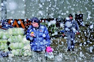 11日8时许,威海市区阵雪。在威海市农副产品批发市场内,售卖蔬菜和水果的商贩冒雪在摊位前等待顾客的到来。