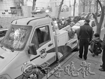 | 12日下午,交警在对佛山苑小区占用消防通道的车辆实施拖车。 本报记者 王兴飞 摄 |
