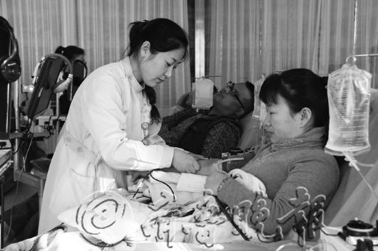 查完体的志愿者们正在捐献血小板。 本报记者 张牟幸子 摄