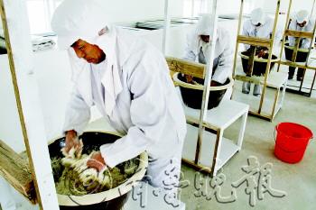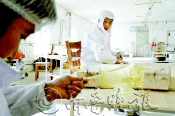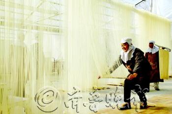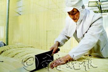 | 工人师傅一字排开,和面。 |  | 搓条,搓成筷子粗细。 |  | 速度太快,看不见手的动作。 |  | 拽面,从三米多高拉到地面。 |  | 切面。 |