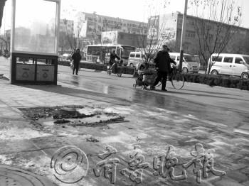 | 污水结冰路段,行人小心通过。 本报记者 郭庆文 摄 |