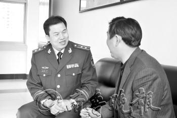 | 张奎杰和被救者家属黄先生聊天。本报记者 路帅 摄 |
