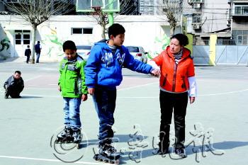 | 生活课老师赵殿海向市民展示学生泡出来的豆芽。(学校供图) |  | 班主任张鹏手把手地教学生学轮滑。 学校供图 |