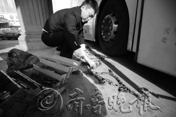 18日,在青岛旅游长途汽车站,工作人员给长途车安装防滑链。当天,交运集团青岛南方分公司开展了冬季行车安全演练活动,目的是保证长途车冬季行车安全。