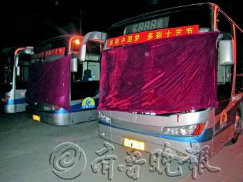 冬季经常出现雾霾、冰雪天气,给公交车早出车造成不良影响,为保证驾驶员安全驾驶,济南公交五分公司六队为每部公交车配备了防霜布帘。驾驶员在晚收车后将布帘挂在车辆前风挡上,可以防止结霜,效果非常好! 摄影 王健