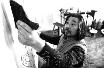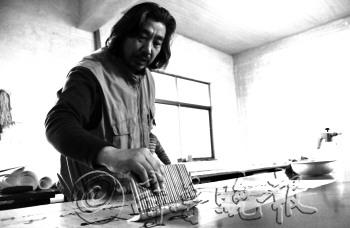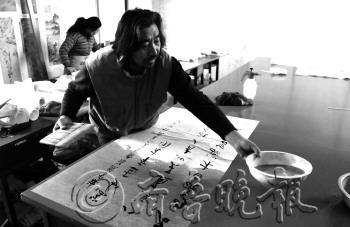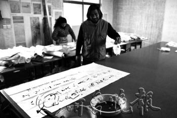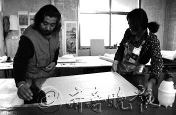 一副上好的书画作品,离不开精湛的装裱技艺。在崔兴伦的工作室里,桌上、地上堆满了准备装裱的字画和各式各样的工具、用料。随着科技的发展,虽然机械装裱技术越来越发达,但作为一项古老的技艺,字画装裱从古代一直延续至今,装裱师们每一个环节都用心制作,崔兴伦就是其中一位。 记者走进崔兴伦的工作室时,他正在欣赏墙上一幅等待晾干的作品。崔兴伦说,晾干的过程他会等上两三天,一来是为了让字画自然晾干,二来自己很喜欢闲暇时对着墙上的字画细细品读。“同一个作者不同时期的创作,都会有不同的风格和表现形式,所以我喜欢在晾干的过程中,享受他们的提升和艺术内涵。” 崔兴伦一边忙着装裱字画,一边告诉记者,装裱过程中有一个环节叫打蜡砑光,现在很多装裱师都会省略这一环节,但他从来不会。说着,只见他拿起一块蜂蜡,均匀地涂满书画的背面,然后用一块五、六斤重的石头,在书画背面反复打磨。“这个过程想快也容易,但一般我会打磨上半个小时,甚至更长。”崔兴伦说,经过这一环节的处理,装裱的书画往往更柔软、致密、光滑,舒卷也更容易。 “从小就喜欢字画,刚开始边打工边学装裱,后来就入了行,成了糊口的行当。”崔兴伦告诉记者,这份工作不仅可以养家糊口,更令他享受其中的是,通过这份工作有机会见到各种风格的书画作品。“现在生活节奏越来越快,装裱技艺中的一些老方法已经渐渐被淡忘,我希望这项技艺能原封不动的一直流传下去,所以一直坚持每一个环节都手工制作。”