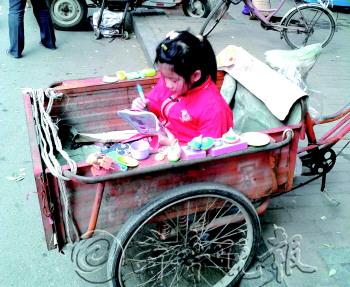 作者自述:小姑娘跟着环卫工妈妈来到大街,坐在三轮车上做作业。