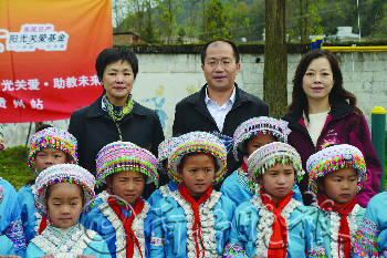 | 陈昊总经理、王秀敏部长、朱晓竹副部长与苗族小朋友合影。 |