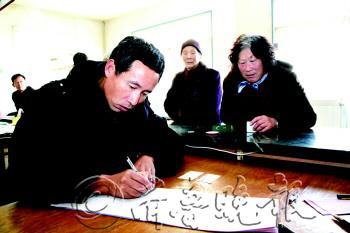 | 东港区合村的一位准备参加失地养老保险的村民在填写完失地村民认定表后,按上手印表示确认。 |  | 东港区合村社区服务中心内,工作人员正在帮助参加失地养老保险的村民填写报名表格。 |  | 一村民准备到合村社区服务中心填写失地村民认定表。 |  | 政策覆盖内村民参加失地养老保险报名并填写失地村民认定表。 |