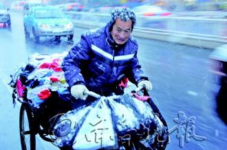 19日,统一路上,漫天飞雪中,一骑三轮车卖塑料袋的老人在寻找顾客。这位周姓老人每天都会沿街售卖塑料袋,他说自已一天净收入大约30-40元左右,每天上街送货,风雪无阻。 本报记者 王震 摄影报道