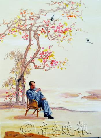 韩坤平:简约背景凸显伟人精神气概 ●韩坤平 济南军区前卫文工团美术技师,济南军区书画研究院委员,中国美术家协会会员,山东画院院聘画家。 我的这幅作品以梅兰竹菊——这四种自古备受人们喜爱的植物为背景,来衬托一代伟人的高风亮节。作品分别刻画了毛泽东从读书青年,到身着戎装的中年,再到壮年、老年的不同时期。 我当了30多年的兵,对毛泽东有着无以言表的特殊的浓厚情感:他的事迹我们耳熟能详,他的诗词我们能熟练背诵,毛泽东是伟大的政治家、军事家、文学家,更是带领中国人民翻身做主的领袖。因此,从事绘画专业后,我一直想画一些能够表现毛泽东形象的创作,借此次毛泽东的120周年诞辰,便创作了这组作品。 为了画好这些作品,我翻阅了许多文字、影像资料,最先画了毛泽东同志坐在梅花树下的形象,主席悠闲从容、气度不凡,与梅花虬枝傲骨相应。紧接着,我又画了毛泽东青年时代的形象,配以青郁竹丛,挺拔向上、坚韧不拔。中国自古便有崇尚然“梅、兰、竹、菊”的审美习惯,我便又根据“兰”和“菊”,创作了另外两幅作品。这样,“四君子”的背景与毛泽东的形象有机融合在一起,相互辉映。此外,整体画面采取了国画的构图、版画的形式,最终用油画表现出来,避免了油画的“满”、减轻画面的压力的效果,也增强了国画的趣味性和表现性。云淡风轻、简约自然的背景,反而更加凸出了植物与人物,更好的表现了伟人的精神气概,表达了画者自身对伟人的崇敬。