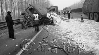 本报12月22日讯(记者 王琳)22日清晨,在青银高速公路潍坊段上发生惊险一幕,一辆满载玻璃板的货车在超车过程中,因没有掌握好与旁边车辆的距离,不小心发生刮擦,车辆失控侧翻在路中央。货车后斗上装载的玻璃板全部倾倒下来摔得粉碎,厚厚的玻璃碴铺满路面。 22日清晨五点多,济青潍坊管理处接到电话称,一辆满载玻璃板的货车在青银高速公路青岛方向168公里左右处翻车,破碎的玻璃碴子盖满了路面。路政工作人员赶往现场发现,一辆济宁牌照的绿色货车侧翻在路面上,车头部位因为受到撞击已经严重变形,前面的挡风玻璃也破了,车轮歪歪扭扭地挂着,车身上多种零件四零八落地躺在地上。“货车后斗周围铺满了大大小小的碎玻璃片,厚的地方有四五十公分高。”路政人员说,玻璃碎片横向几乎覆盖了整个路面,纵向覆盖了将近五十米,从远处看整个事故现场像下过雪一般,白花花的一片。 据介绍,事故发生时,这辆载着重达十八九吨玻璃的货车正在行驶中,打算赶超车前方另一辆货车,不料在超车过程中因为与对方贴得太近,发生了刮擦。随后该车在被超货车前方失控发生了侧翻,后斗上的一摞玻璃板随着架子倾落而下,碎了一地。所幸事故没有造成人员伤亡。 事故发生后,现场已经没法正常通车,幸好事故发生时车辆较少,没有对其他过往车辆和司机造成伤害。随后,路政人员进行了变道处理,引导同向行驶的车辆暂时去另一车道行驶,以免造成堵车,同时调来了两辆大型铲车,将地表上的大块碎玻璃铲入货车运走。“留在路面上的细小玻璃碴子铲车没法起作用,只能靠人工清扫。”路政人员说,八位工作人员清扫了两个多小时,才将地面彻底打扫干净。到早上九点左右,事故处理完毕,该路段恢复正常通车。