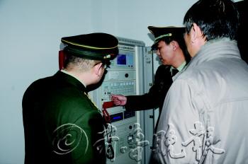 | 检查人员对淄博剧院消防控制室内的中控柜进行检查。 本报记者 姜文洁 摄 |