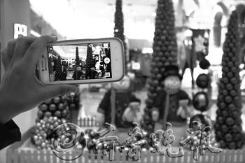 23日,市民在德百大楼内摆放的圣诞装饰物前拍照留念。据了解,圣诞节已成为商家盈利的重要噱头,各商场都瞄准商机,备足货源,推出各类优惠促销活动抢占市场。