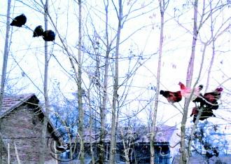 作品描述:太阳落山,倦鸡宿高巢。这高高的鸡巢经济、环保、不占耕地。