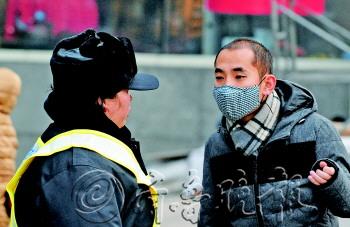 25日,在历山路一路口,一名交通协管员回答戴口罩的路人问路,自己却没有戴口罩。连日来,雾霾天明显增多,空气质量较差,不少市民呼吁,长时间在户外工作的交警和协管员应该随时佩戴口罩,保护健康。考虑到需要吹哨子等职业特点,有关部门最好能为他们尽快研制特殊造型的口罩。 本报记者 周青先 摄