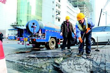 25日下午2点左右,西盛街与青年路交接路口处的酒店楼前污水井堵塞,污水流到了街面上。这本该由产权单位负责处理,但市排水处工作人员调来高压清洗车、吸污车,忙活了半个小时帮忙清理了污水井。
