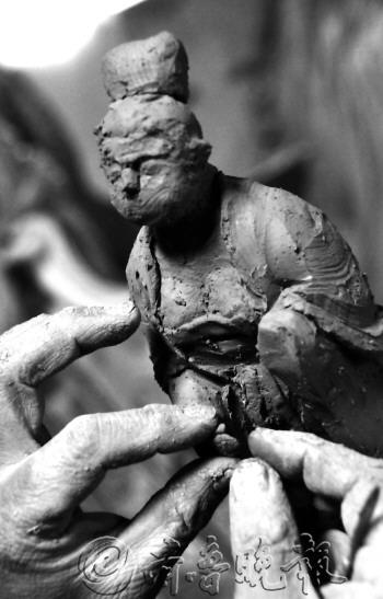 精雕细琢。 增补细节。 琢磨造型。 调制颜料。 给你一块泥巴,你能做什么? 刘瑞东可以用它捏出无数的人物造型。 各朝各代的历史人物、变换万千的服饰和头饰……刘瑞东在脑海里积累了无数的人物模板。除此之外,他一人可以包揽扎架、上泥、翻模、彩绘等所有工艺,是个实实在在的“泥人刘”。 26日,刘瑞东正准备制作一件小型文成公主泥塑。两块长短不同的木棍,用气枪固定好,就有了泥塑的小支架,三下两下糊上泥巴,已经依稀可见一个古代女性的身姿。 “唐朝以胖为美,下巴要圆润一些,还要加一个双下巴,服饰上要体现水袖的飘逸感。”正说着,刘瑞东手中的泥塑渐渐现出了眉眼,一位风姿绰约的丰腴女性就展现在眼前。 仅仅10多分钟,一件小型文成公主的“大感觉”已经完成。这件小泥塑还要经过打磨、修光、上石膏、翻模等工序。经过六七个月的精细制作,才可以看到一个栩栩如生的文成公主。 刘瑞东一直和泥塑有着不解之缘。他小时候用泥巴捏出玩具水枪和泥娃娃,现在塑造出关公、土地奶奶等历史民俗人物。对于刘瑞东来说,泥塑不仅是一件工艺品,更是对传统手工艺的一种传承。 现在,“泥人刘”计划制作代表济宁文化历史的人物形象,力争将其打造成泥塑精品。 刘瑞东说,他可以废寝忘食地在工作室待十五六个小时,也可以为了泥塑不计成本。因为做着喜欢的事情,而且以此为生,是他最幸福的事儿。