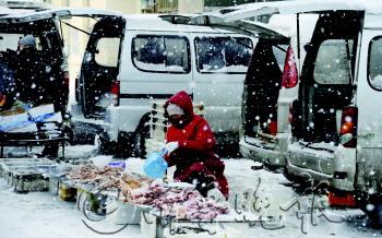 | 26日,天空飘着雪花,在金沟寨小区,一位摊主冒着严寒出摊。 本报记者 李泊静 摄 |