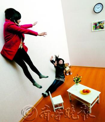 26日,在人民广场青少年宫,新搭建的“视觉错位”场景吸引了参观者。原本应该在地面上的桌子却摆到了墙上,颠倒的房间,错位的鞋子,给人们带来了奇幻的视觉感受。据了解,青少年宫3D魔幻摄影体验展,在展出3D画面的同时,还设置了数组“视觉错位”场景,丰富了展览的内容,将观众带入了另外一个视觉思维空间。