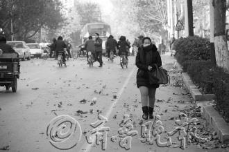 | 大风扬起灰尘,市民掩面而行。 本报记者 赵艳虹 摄 |
