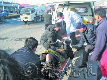 | ◤货车因气温低打不着火,司机烤油箱致车辆起火。 |  | ▲司机衣服被烧烂,医护人员紧急将其送往医院救治。 |