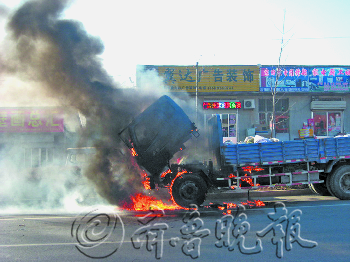 本报临沂12月28日讯(记者 高祥 通讯员 吴云富 刘锋) 一辆菏泽郓城籍的货车途经临沂费县时,因为天冷油跟不上突然熄火,司机在车下点火烤油箱,致油箱起火引燃车辆,司机也因衣服引燃被烧伤。 27日上午9点多,临沂市费县南外环公路松鹤食品厂门前路段,一辆货车突然着火。司机在扑打火苗时衣服被引燃,导致身上多处烧伤。过路群众上前帮忙救火,但由于火势太猛,货车很快被烟火笼罩。 费县消防人员接警后,迅速赶到现场,经过扑救,最终将大火扑灭,被烧伤的货车司机也被随后赶来的120急救车送往医院救治。由于着火时间较长,火势较猛,货车几乎报废。 据货车押车人员介绍,他们从菏泽郓城出发,准备到临沂苍山装萝卜。车辆行驶到事发地点时,因为天冷油跟不上突然熄火,之后再也打不着火。司机随后下车,找了点柴火点着后烤油箱,没想到刚烤了不一会儿,油箱里突然蹿出火苗,惊慌失措的司机连忙扑打火苗,但因火势很猛,司机衣服也被烧着了,造成身上多处被烧伤。 出勤交警提醒,冬季天冷,司机要对车辆油箱、油管等采取一定的保温措施,也可加注低标号的抗凝柴油混合应急,或者用开水加热供油系统。遇到打不着火的时候,千万不要用明火烤油箱,否则很容易引起火灾,甚至发生车辆爆炸事故。