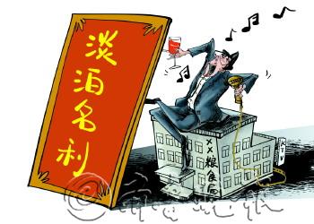 在陕西省澄城县粮食局的办公所在地,角落里有一间被门卫称作“领导的休息室”的房间。开门一看,沙发、茶几、电视、音响、麦克风等在KTV包房里才能见到的东西一一出现在记者面前。在这间具有唱歌加洗脚按摩的多功能包房里,写有“淡泊名利”字样的牌子十分醒目。(据陕西电视台报道) 漫画/曹一